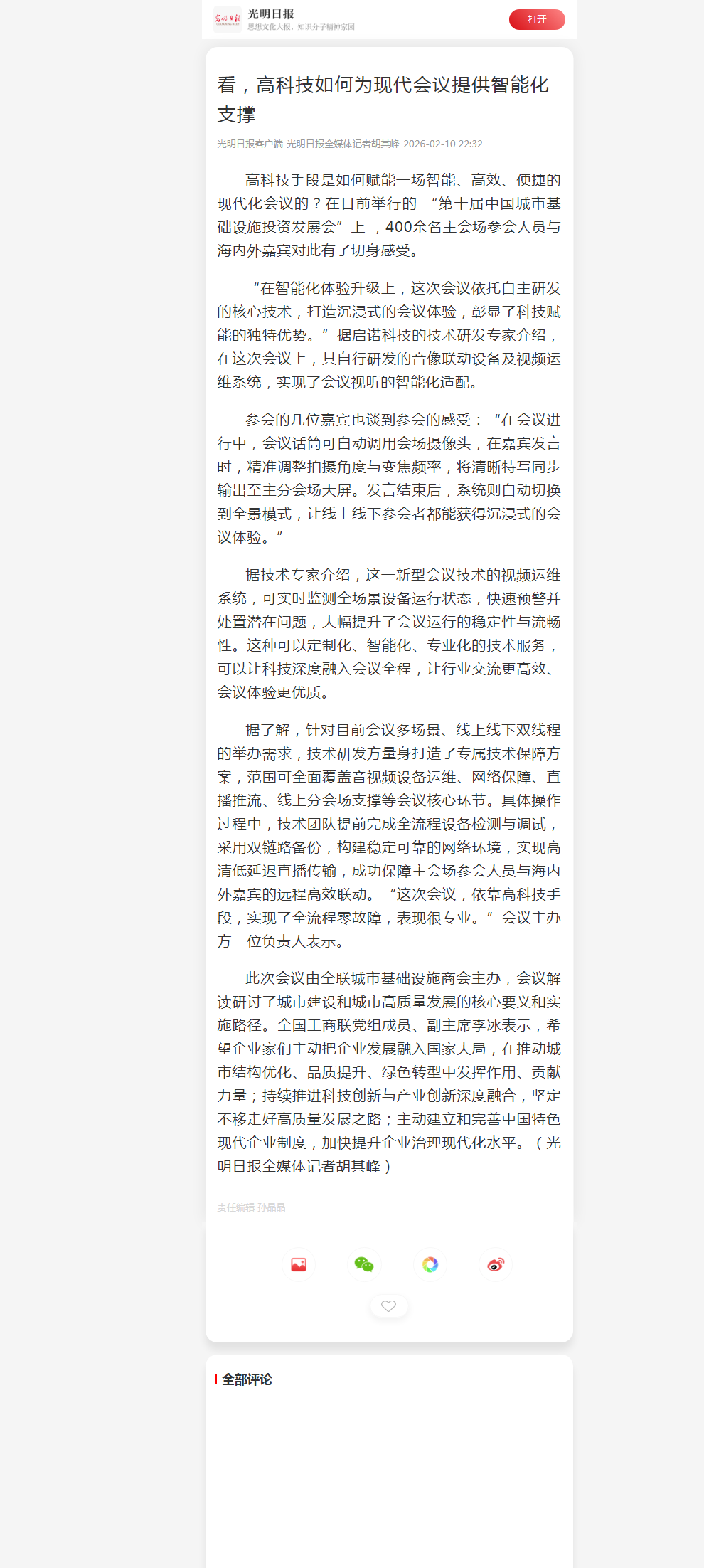 光明日报于2026年2月10号报道了关于"第十届中国城市基础设施投资发展会“,做为全国工商联商城市基础设施商会的理事单位,我司受邀请出席会议、并在会前受邀安排技术人员做会议的保障和技术支持,会议取得圆满成功,启诺科技的服务得到的与会人员的赞赏!